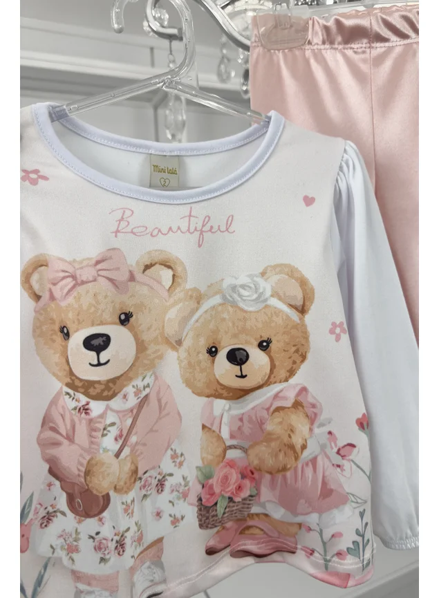 Conjunto ursinhos conta com uma calca legging cirree na cor rosa claro e uma blusa mangas longas .
